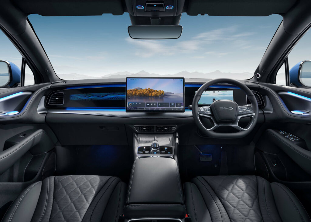 Step inside and the SEALION 7’s cabin leans into premium tech and comfort, with a 10.25-inch digital instrument cluster and a 15.6-inch intelligent rotating infotainment screen. The experience is elevated by a silver-plated panoramic glass roof, 12-speaker Dynaudio sound system, 128-colour ambient lighting, and a 50W wireless charger with cooling—plus an intelligent W-HUD to keep key info in your line of sight.